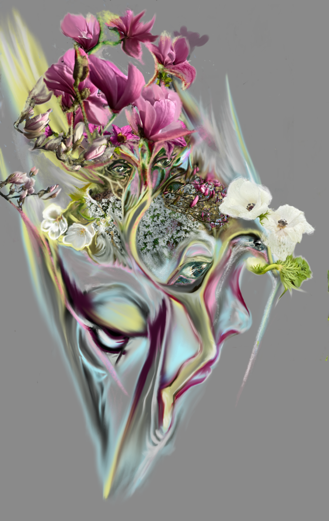 Description: A surreal composition featuring a human face intertwined with floral elements and city architecture. The vibrant colors and juxtaposition create a dreamlike atmosphere.