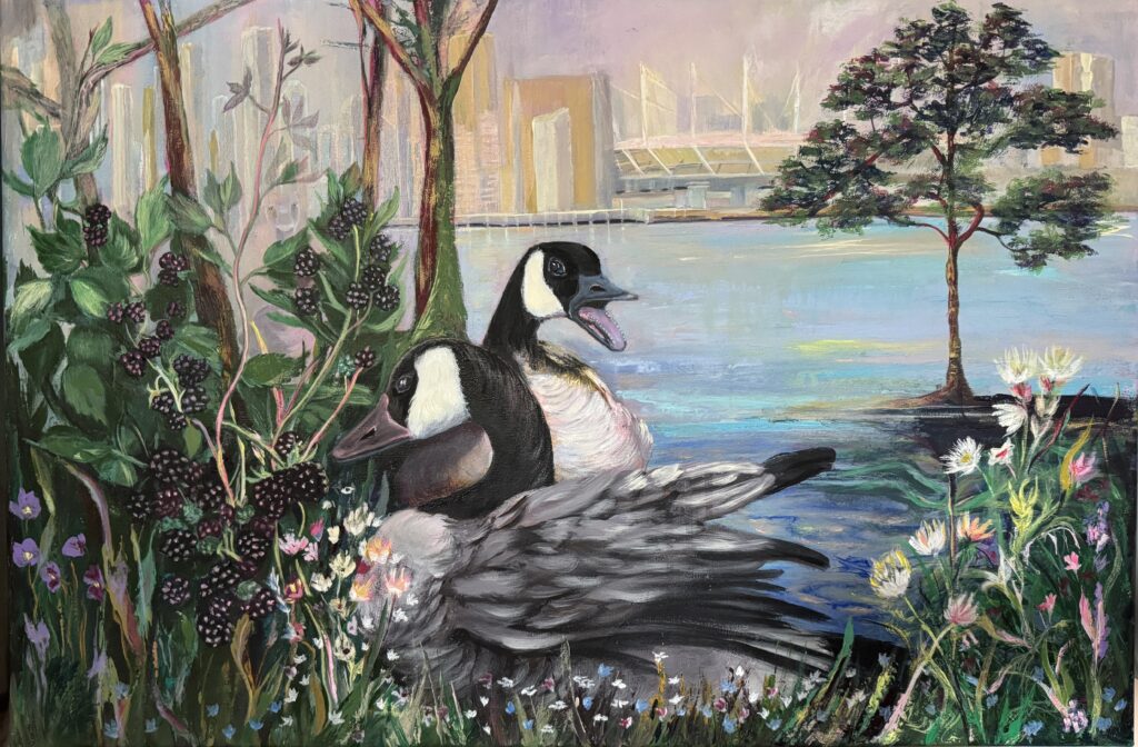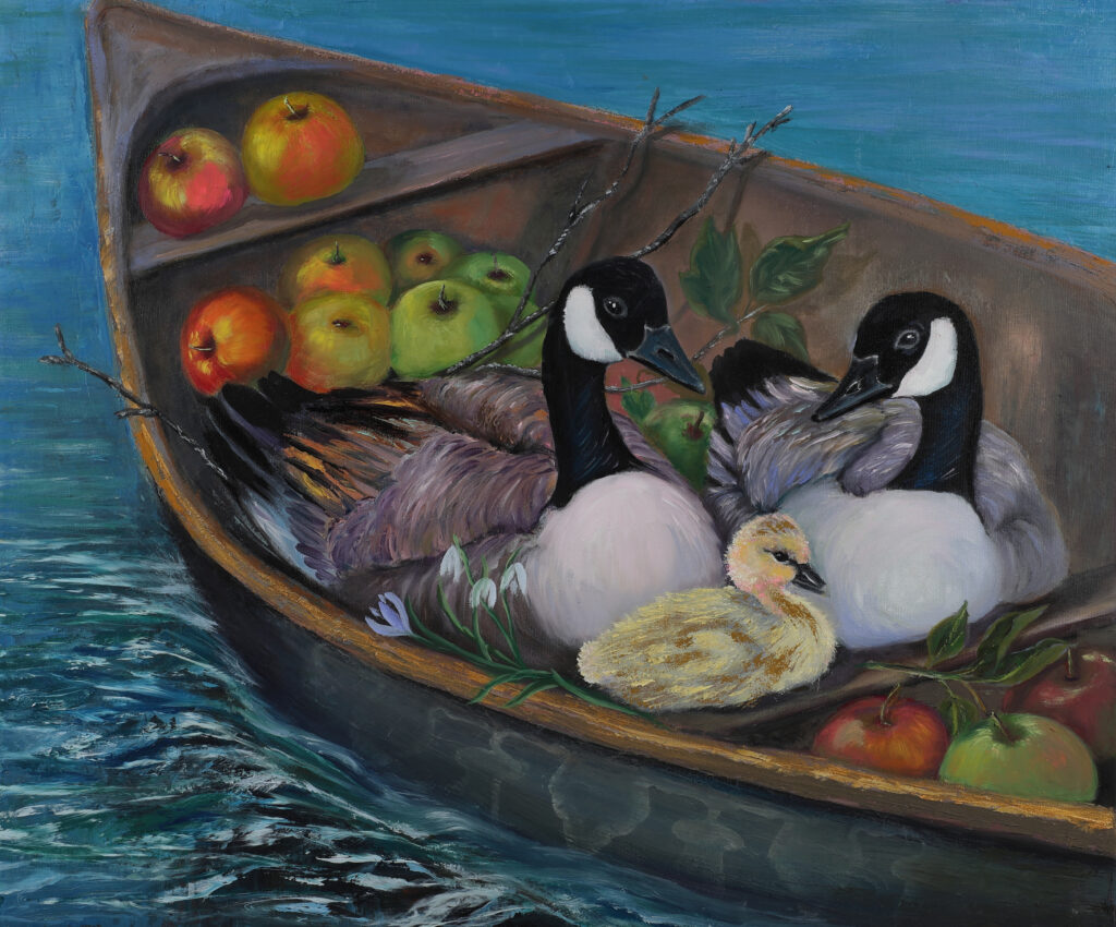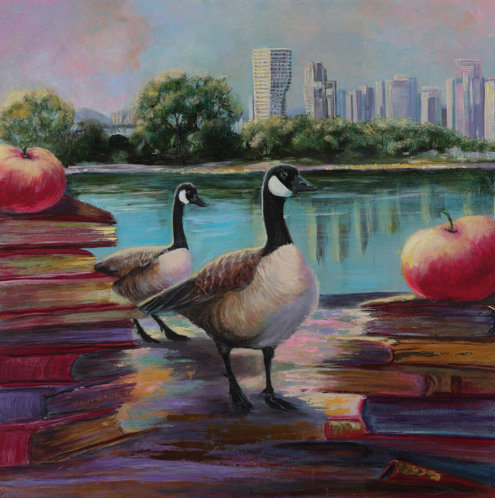 This painting brings together symbols of knowledge, migration, and quiet adaptation. Two Canadian geese stand at the water’s edge between stacks of books and ripe apples, forming a passage rather than a barrier. The geese move calmly through a reflective surface that mirrors both trees and a distant modern city, suggesting continuity between nature and human-built environments. The books evoke accumulated knowledge and experience, while the apples hint at growth, choice, and renewal. The scene is not allegorical in a fixed sense, but contemplative — inviting reflection on how learning, memory, and migration coexist as organized, life-sustaining processes rather than acts of disruption.