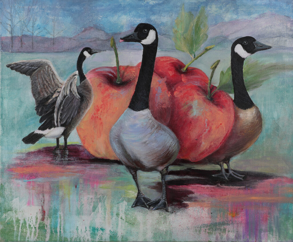 Harvest Parade is a celebration of renewal and the healing power of nature. Created after a personal turning point, this piece reflects how the landscapes of Vancouver, its light, wildlife, and rhythm helped restore my creative voice. Canadian geese, symbolic of strength and migration, stand beside surreal, oversized apples that represent abundance and transformation. Their playful scale and vivid textures blend realism with expressive freedom, capturing the balance between clarity and chaos in emotional healing. Harvest Parade is not just an image; it’s a story of gratitude for the land that inspired me back to life.