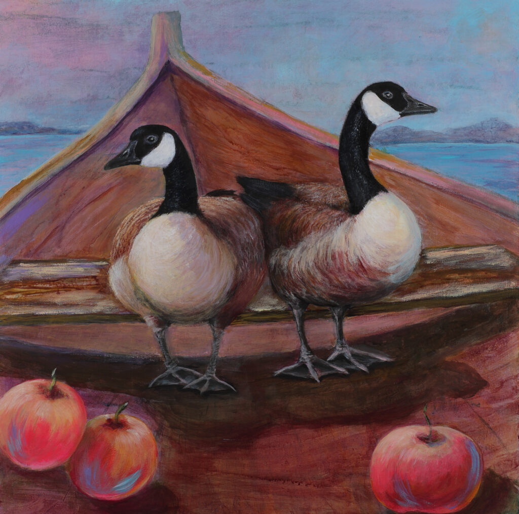 Two Canadian geese stand at the bow of a wooden boat, steady and alert, facing different directions. The boat is not in motion, yet it suggests travel, memory, and passage. Around them, apples rest on the ground, ordinary, grounded, and seasonal — while the muted landscape dissolves softly into water and sky. This painting explores migration not as urgency or escape, but as continuity. The geese are neither heroic nor symbolic in a literal sense; they exist as they are — present, watchful, and adapted to place. The boat becomes a threshold rather than a destination, holding the tension between stillness and movement. Rooted in Canadian landscapes and rhythms, The Quiet Crossing I reflects on coexistence: between nature and human traces, between past and present, between staying and leaving. The work invites viewers to pause within this moment of balance, where nothing dramatic happens — yet everything is in transition.