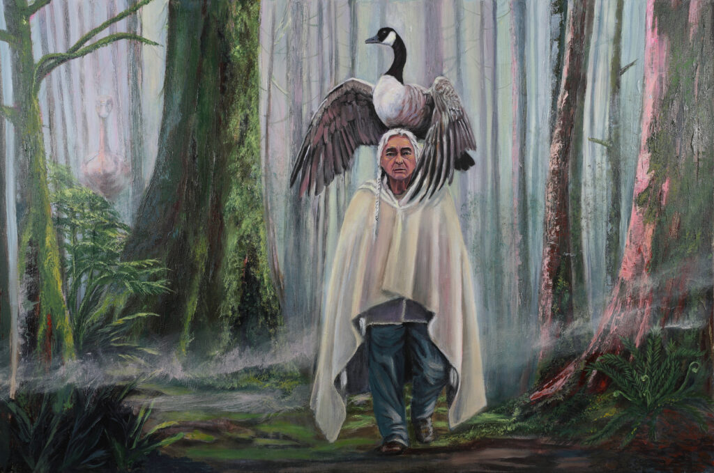 A Yakama Nation elder walks through a forest layered in vertical light. A Canada goose spirit appears within the trees – grounded, watchful, quietly luminous. The forest acts as a witness rather than a backdrop, holding both the elder and the bird in a shared space. Neither dominates; both belong to the presence. The work reflects on the reciprocal presence of land as listener, life as interwoven. Within this woodland, protection is organic and coexistence is natural. Elder, goose, and forest exist in quiet continuity, sustained by the same breath.