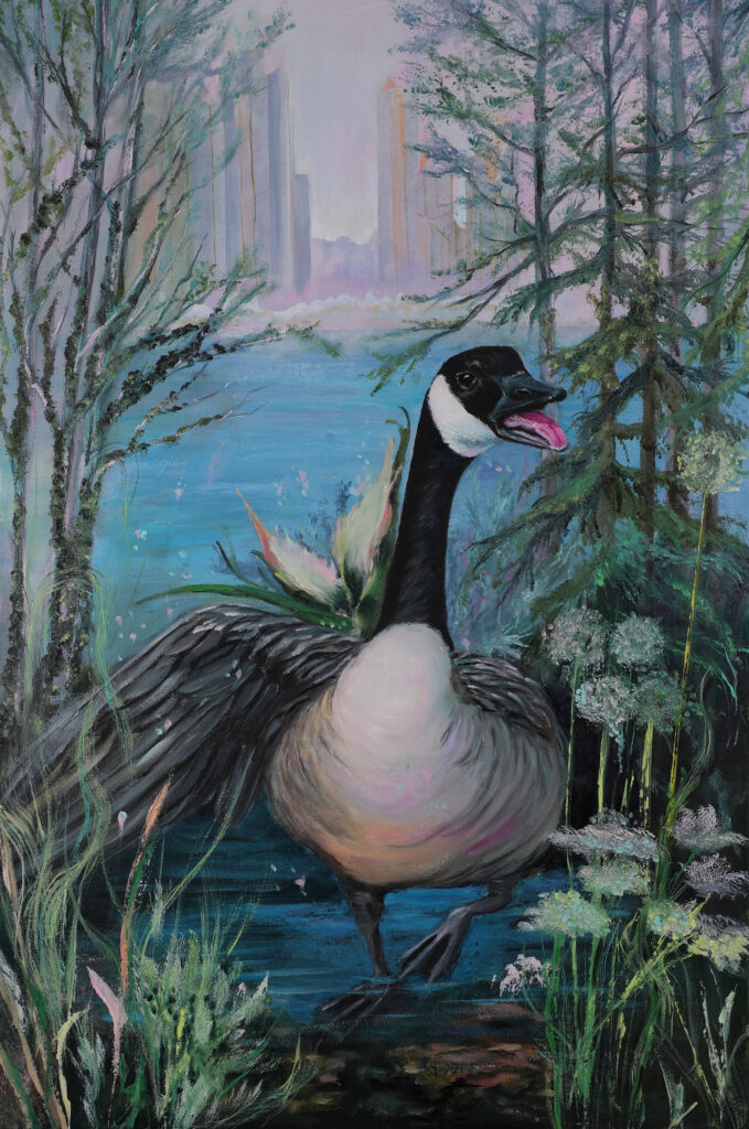 A single Canadian goose stands in shallow water, framed by forest and softened light. One foot is raised, the beak slightly open, suggesting breath or the beginning of movement. In the distance, a faint city skyline dissolves into mist, present but subdued. The work reflects on moments of pause within change, where reflection gathers through attentiveness to place, memory, and the quiet coexistence of natural and human worlds.