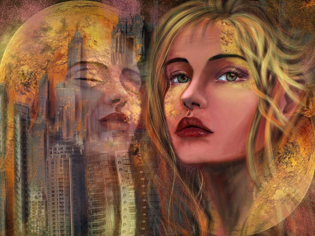 A woman’s face emerges prominently against a backdrop of urban skyscrapers, blending surreal elements with vivid color contrasts. Her serene expression and flowing hair evoke a sense of contemplation amidst the cityscape.