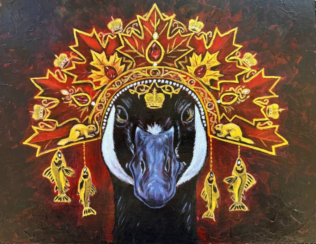 A goose is portrayed wearing an elaborate crown with red and gold details. The crown is adorned with maple leaves, jewels, and small salmon hanging as embellishments. It’s a fierce representation of strength at the centre. All kinds of Canadian symbols surround the fierce strength at the centre, fostering a sense of pride and cultural connection. It symbolizes the power of the united nature and humanity. The contrast between the dark background and the vibrant reds and golds brings the intricate details to life in an inviting way.